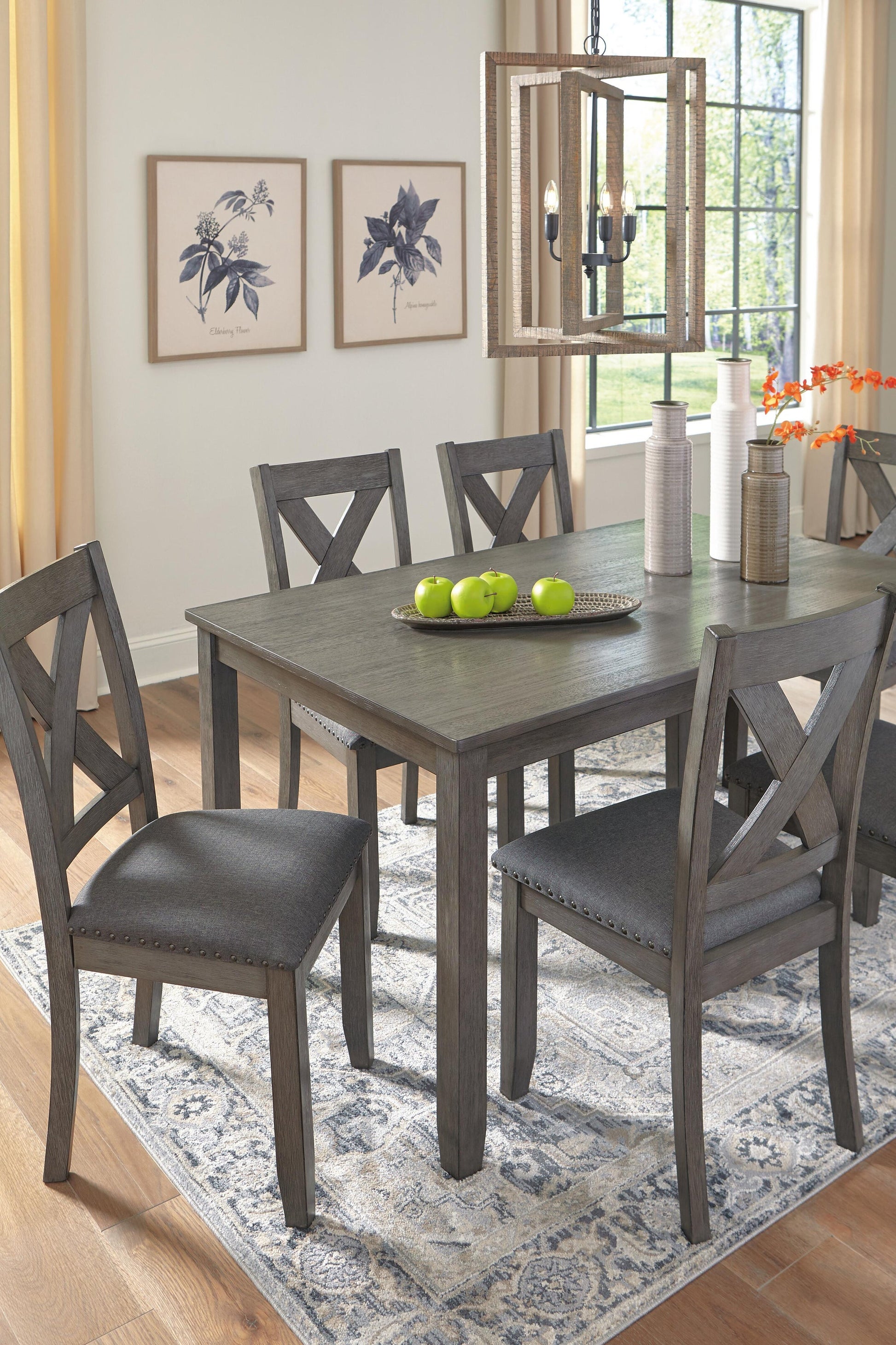 | Details | Includes dining table and 6 chairs, Table made of wood, acacia veneer and engineered wood; chairs made of wood, Antiqued gray wash finish, Foam cushioned seat with linen-weave polyester upholstery, Nailhead accents, Seats 6, Assembly required | |