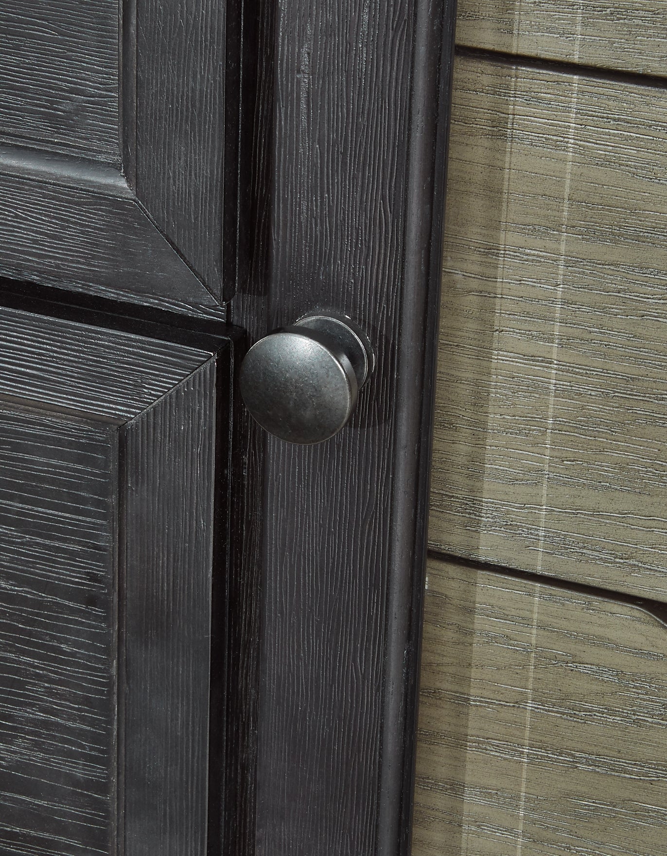 Details | B989B5: Includes California king panel headboard, storage footboard, and rails with roll slats, Made with hardwood solids, select oak veneers and engineered wood, Two-tone finish (brushed black and dusty grayish brown wood tone), Headboard with picture frame moulding, Footboard with two deep drawers, Smooth-gliding soft-close drawers with fully finished interiors and dovetail construction, Sleek drawer pulls with black finish, Bed does not require additional foundation/box spring; accommodates most zero clearance adjustable bases with the addition of a bunkie board, Mattress available, sold separately, Assembly required, B989B1: Includes dresser and mirror, Made with hardwood solids, select oak veneers and engineered wood, Two-tone finish (brushed black and dusty grayish brown wood tone), Sleek drawer pulls with black finish, 11 soft-close, smooth-gliding drawers with fully finished interiors and dovetail construction (top drawers felt lined), 5 drawers with brushed black finish; 6 drawers with grayish brown wood tone, 3 drawers located behind each door, Mirror mounts to back of dresser, Assembly required, B989-48: Made with hardwood solids, select oak veneers and engineered wood, Two-tone finish (brushed black and dusty grayish brown wood tone), Sleek drawer pulls with black finish, 5 soft-close, smooth-gliding drawers with fully finished interiors and dovetail construction (top drawers felt lined), 3 pull-out trays (felt lined) and 2 adjustable shelves behind door, | |