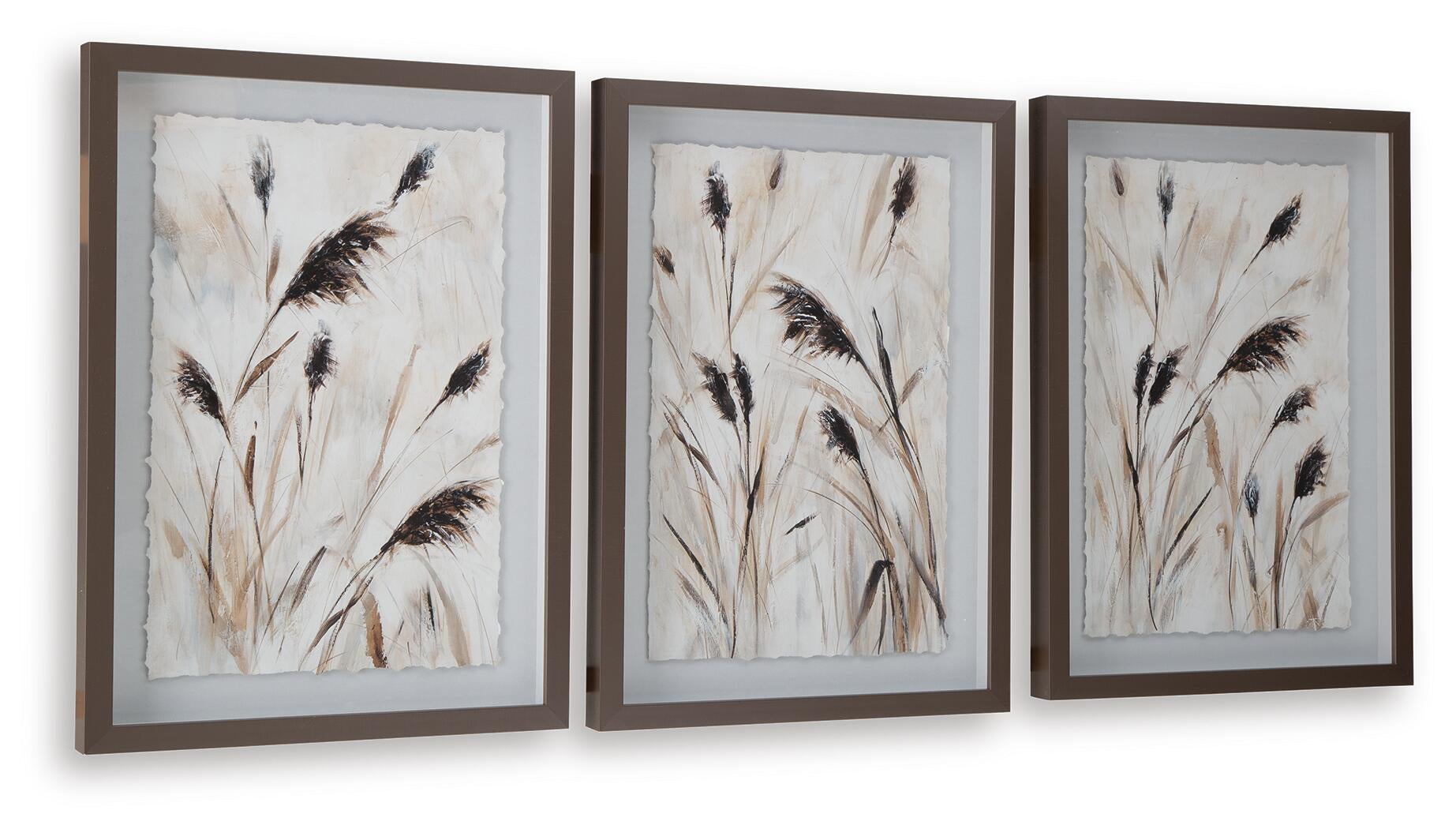 | Details | Set of 3, Raised print, Brown shadowbox frame, Glass front, D-ring bracket for hanging, Vertical hanging only | |