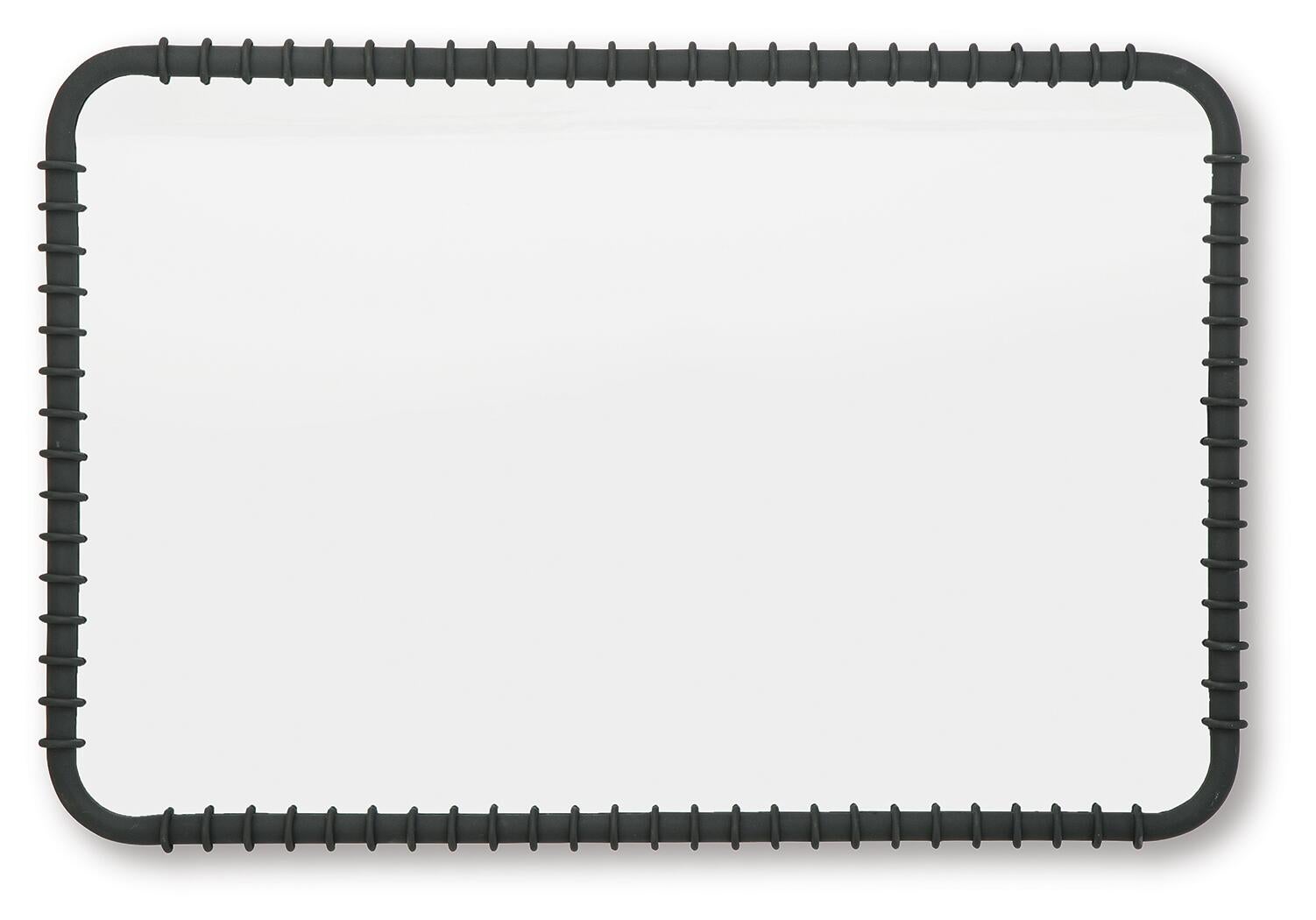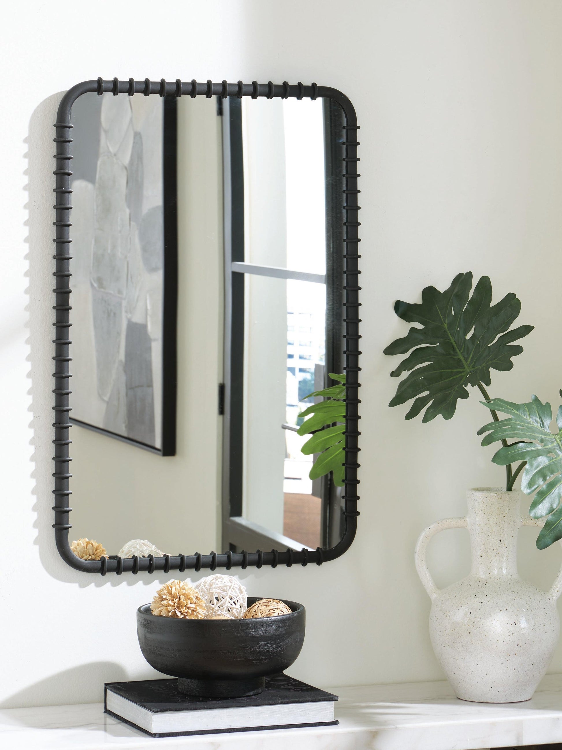 This accent mirror's sleek black finish and ribbed design add a touch of contemporary chic to any room. Its versatile hanging options allow you to display it vertically or horizontally, making it easy to complement your existing decor. The clean lines and simple shape create a modern and minimalist feel, while the substantial frame adds a touch of boldness.