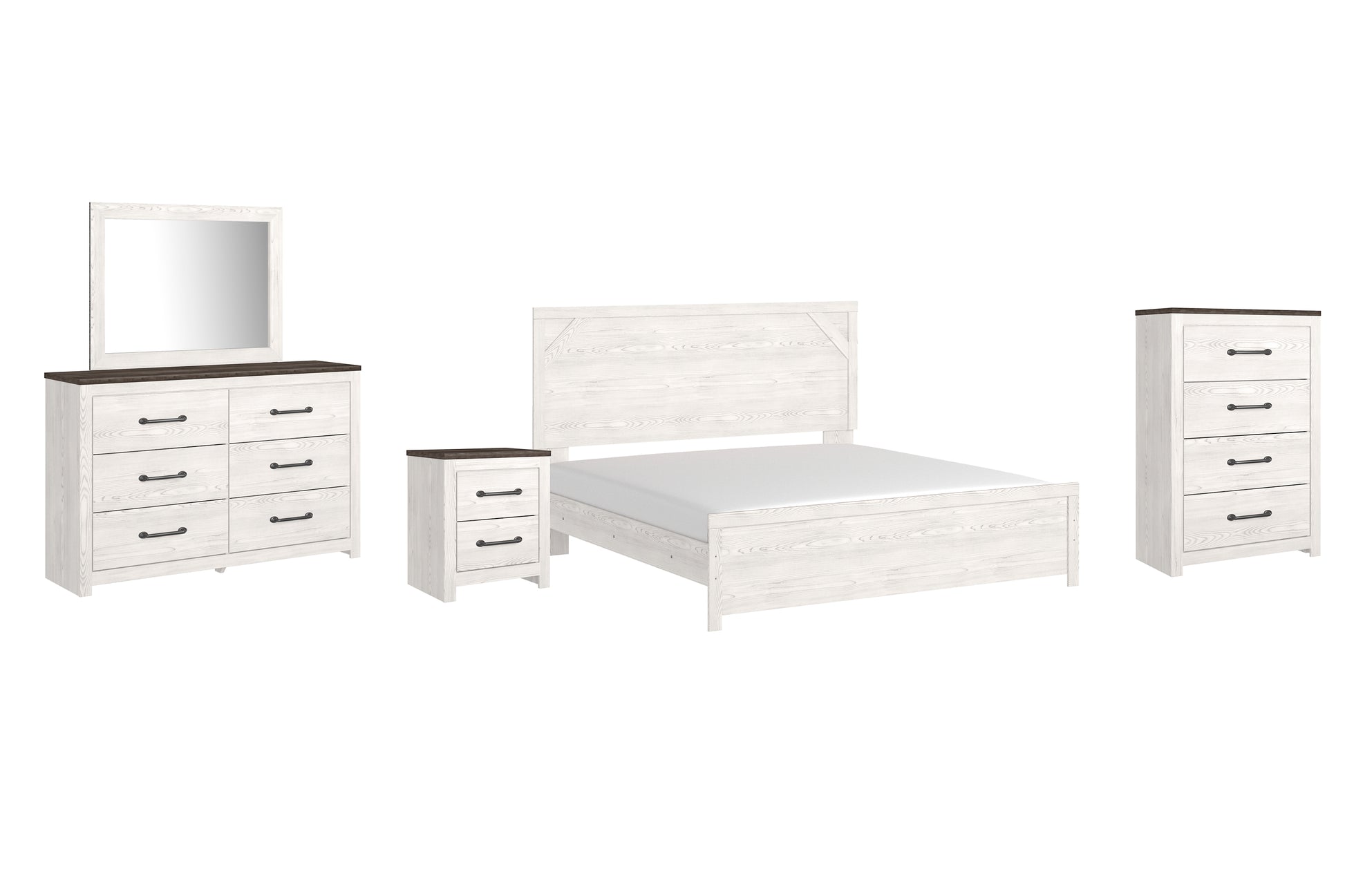 Details | B1190B3: Includes headboard, footboard and rails, Made of engineered wood (MDF/particleboard) and decorative laminate, White rustic finish with replicated cedar grain, Foundation/box spring required, sold separately, Mattress not included, sold separately, Assembly required, Bed is compatible with an adjustable base, B1190B1: Includes dresser with mirror, Made of engineered wood (MDF/particleboard) and decorative laminate, White rustic finish with replicated cedar grain, Rustic gray planked replicated oak grain with authentic touch, 6 smooth-gliding drawers with faux linen lining, Large scale dark colored handles, Mirror attaches to back of dresser, Assembly required, B1190-44: Made of engineered wood (MDF/particleboard), and decorative laminate, White rustic finish with replicated cedar grain, Rustic gray planked replicated oak grain with authentic touch, 4 smooth-gliding drawers with faux linen lining, Large scale dark colored handles, Safety is a top priority, clothing storage units are designed to meet the most current standard for stability, ASTM F 2057 (ASTM International), Drawers extend out to accommodate maximum access to drawer interior while maintaining safety, Assembly required, B1190-92: Made of engineered wood (MDF/particleboard), White rustic finish with replicated cedar grain, Rustic gray planked replicated oak grain with authentic touch, 2 smooth-gliding drawers with faux linen lining, Large scale dark colored handles, Assembly required, | |