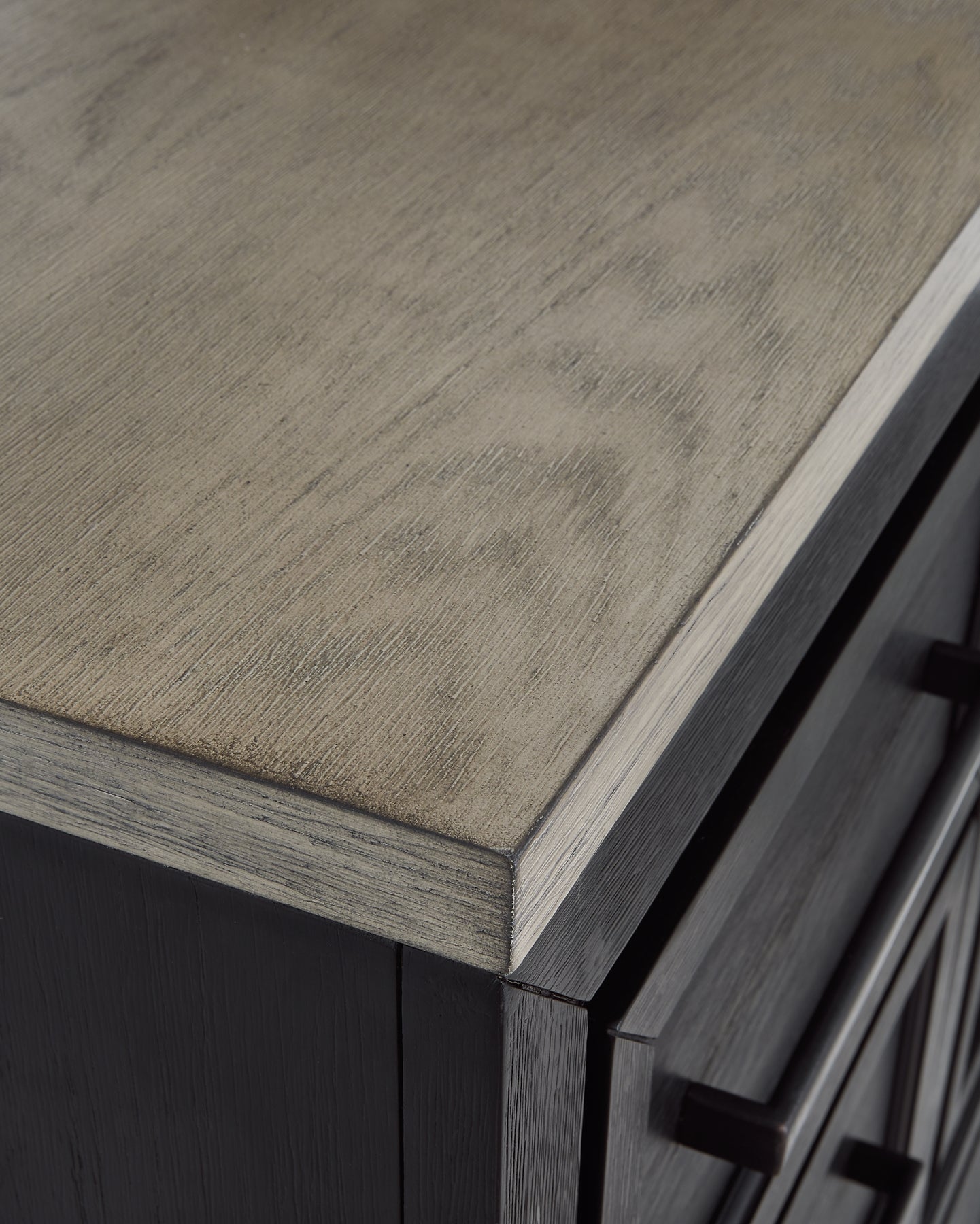 Details | B989B4: Includes king panel headboard, storage footboard, and rails with roll slats, Made with hardwood solids, select oak veneers and engineered wood, Two-tone finish (brushed black and dusty grayish brown wood tone), Headboard with picture frame moulding, Footboard with two deep drawers, Smooth-gliding soft-close drawers with fully finished interiors and dovetail construction, Sleek drawer pulls with black finish, Bed does not require additional foundation/box spring; accommodates most zero clearance adjustable bases with the addition of a bunkie board, Mattress available, sold separately, Assembly required, B989B1: Includes dresser and mirror, Made with hardwood solids, select oak veneers and engineered wood, Two-tone finish (brushed black and dusty grayish brown wood tone), Sleek drawer pulls with black finish, 11 soft-close, smooth-gliding drawers with fully finished interiors and dovetail construction (top drawers felt lined), 5 drawers with brushed black finish; 6 drawers with grayish brown wood tone, 3 drawers located behind each door, Mirror mounts to back of dresser, Assembly required, B989-48: Made with hardwood solids, select oak veneers and engineered wood, Two-tone finish (brushed black and dusty grayish brown wood tone), Sleek drawer pulls with black finish, 5 soft-close, smooth-gliding drawers with fully finished interiors and dovetail construction (top drawers felt lined), 3 pull-out trays (felt lined) and 2 adjustable shelves behind door, B989-92: Made with hardwood solids, select oak veneers and engineered wood, Two-tone finish (brushed black and dusty grayish brown wood tone), Sleek drawer pulls with black finish, 2 soft-close, smooth-gliding drawers with fully finished interiors and dovetail construction, 110V power supply with dual USB charging port, Power cord included; UL listed, | |