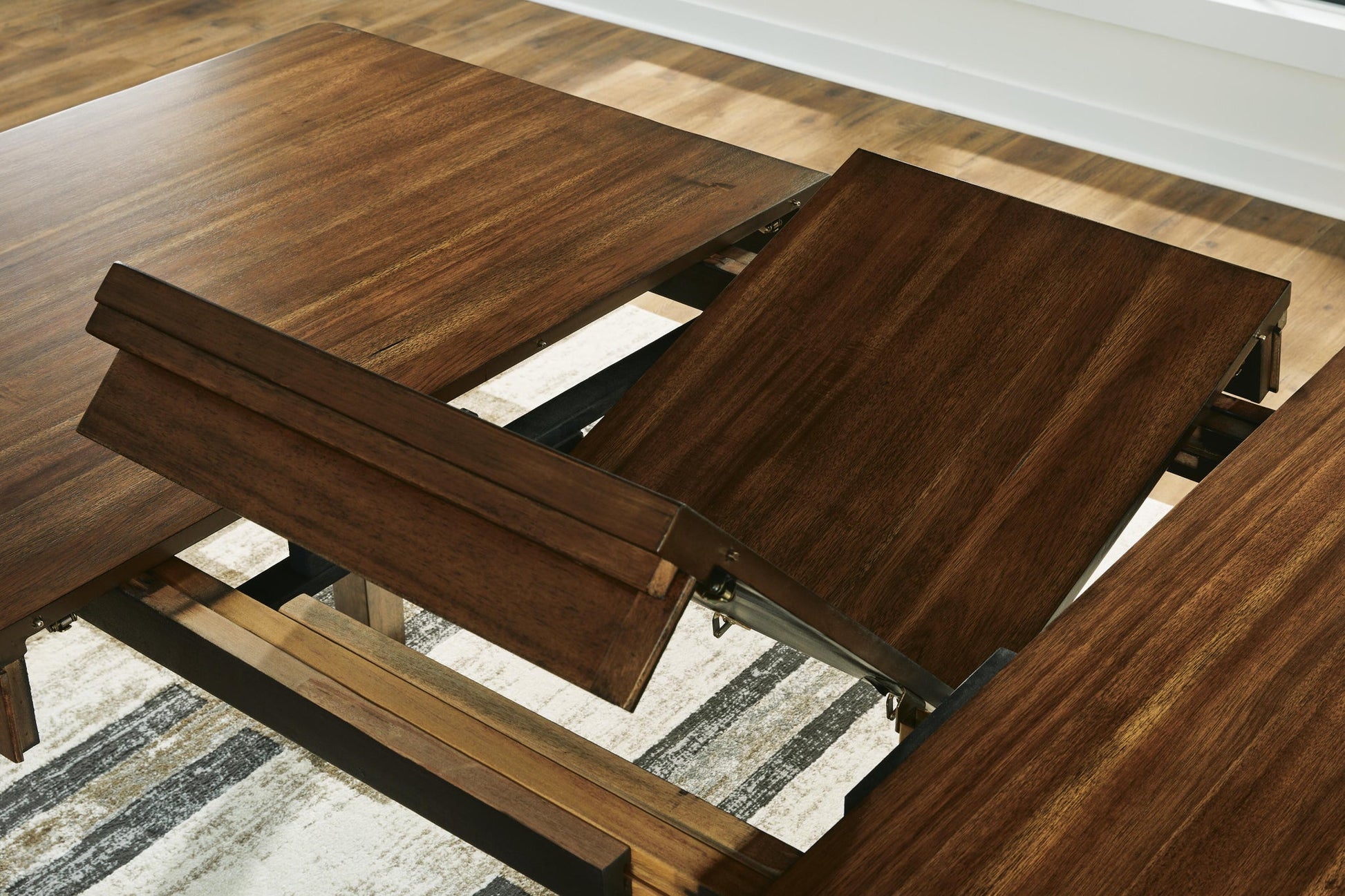 | Details | Made with hardwood solids, select acacia veneers and engineered wood, Gently distressed and burnished dark brown finish, Self-storing butterfly leaf is a flexible, space-saving solution, Leaf folds away under table top when not in use, Seats up to 8, Assembly required | |