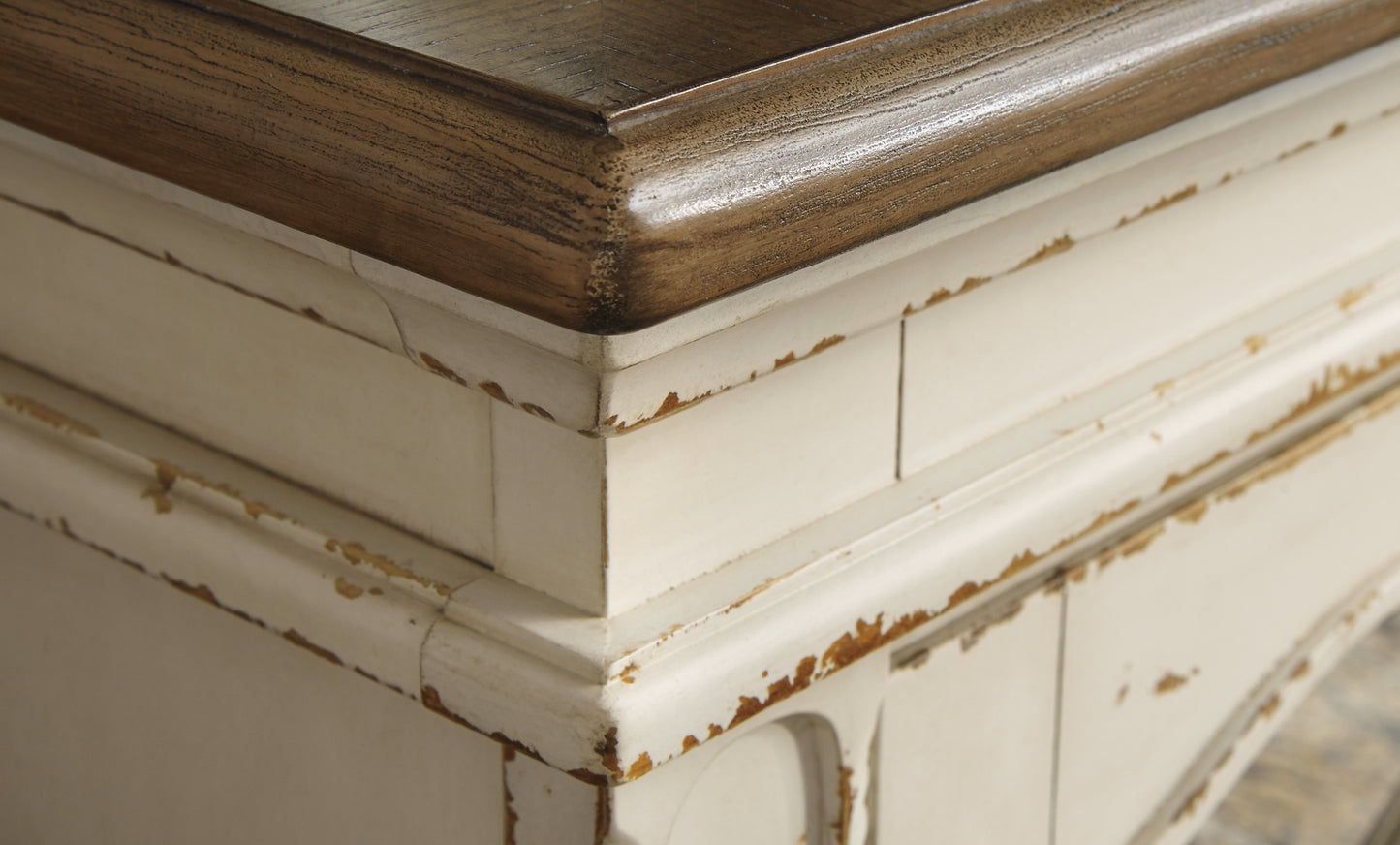 Elevating the art of traditional cottage styling, this TV stand with fireplace option is beautifully in tune with your taste. Antiqued two-tone aesthetic blends a chipped white with a distressed wood tone top for added charm. Cabinet doors’ decorative fretwork over mirrored glass adds a lovely twist. Compatible with W100-121 fireplace insert (sold separately).