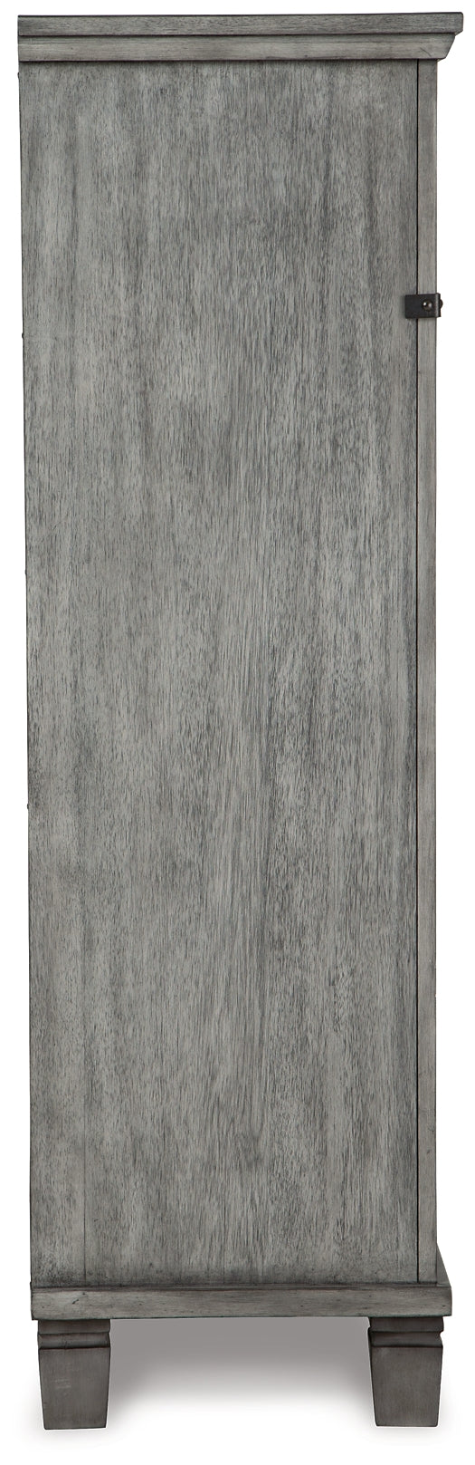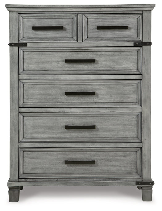 What's old is what's new with this chest. Serving up a fresh look in urban farmhouse style, the eclectic piece features a light weathered gray finish with dark aged bronze-tone bar pulls and metal straps for a casually cool sensibility. Profiled drawer frames, thick-profiled top moulding and tapered legs are the earmarks of timeless design.