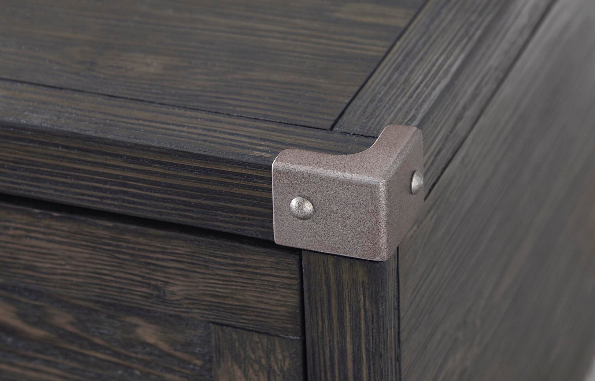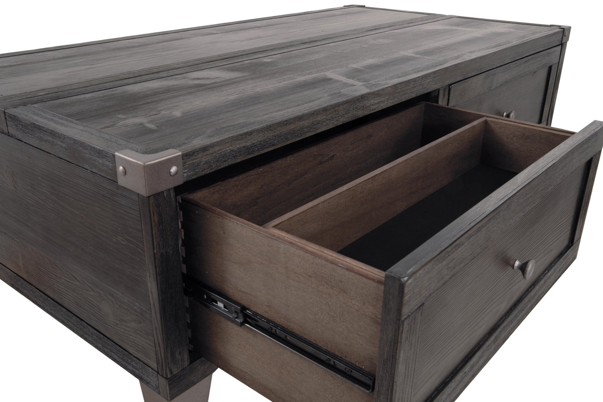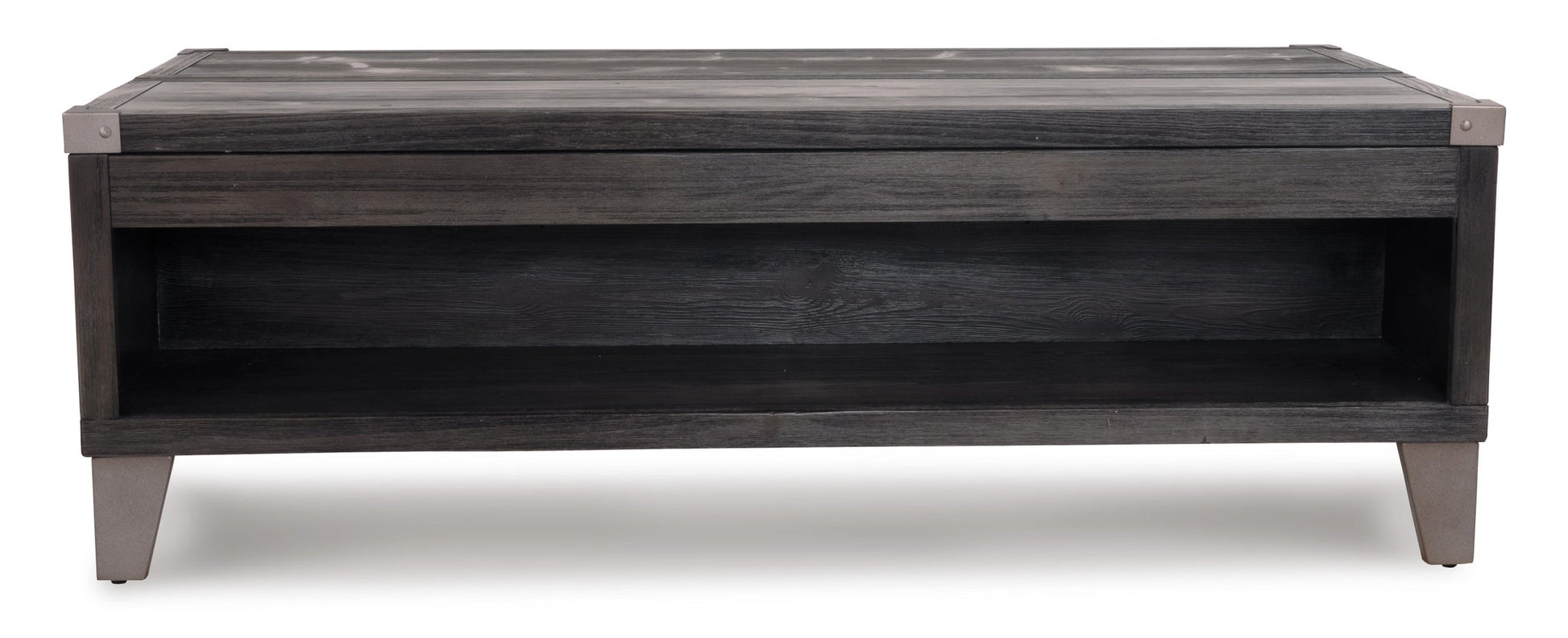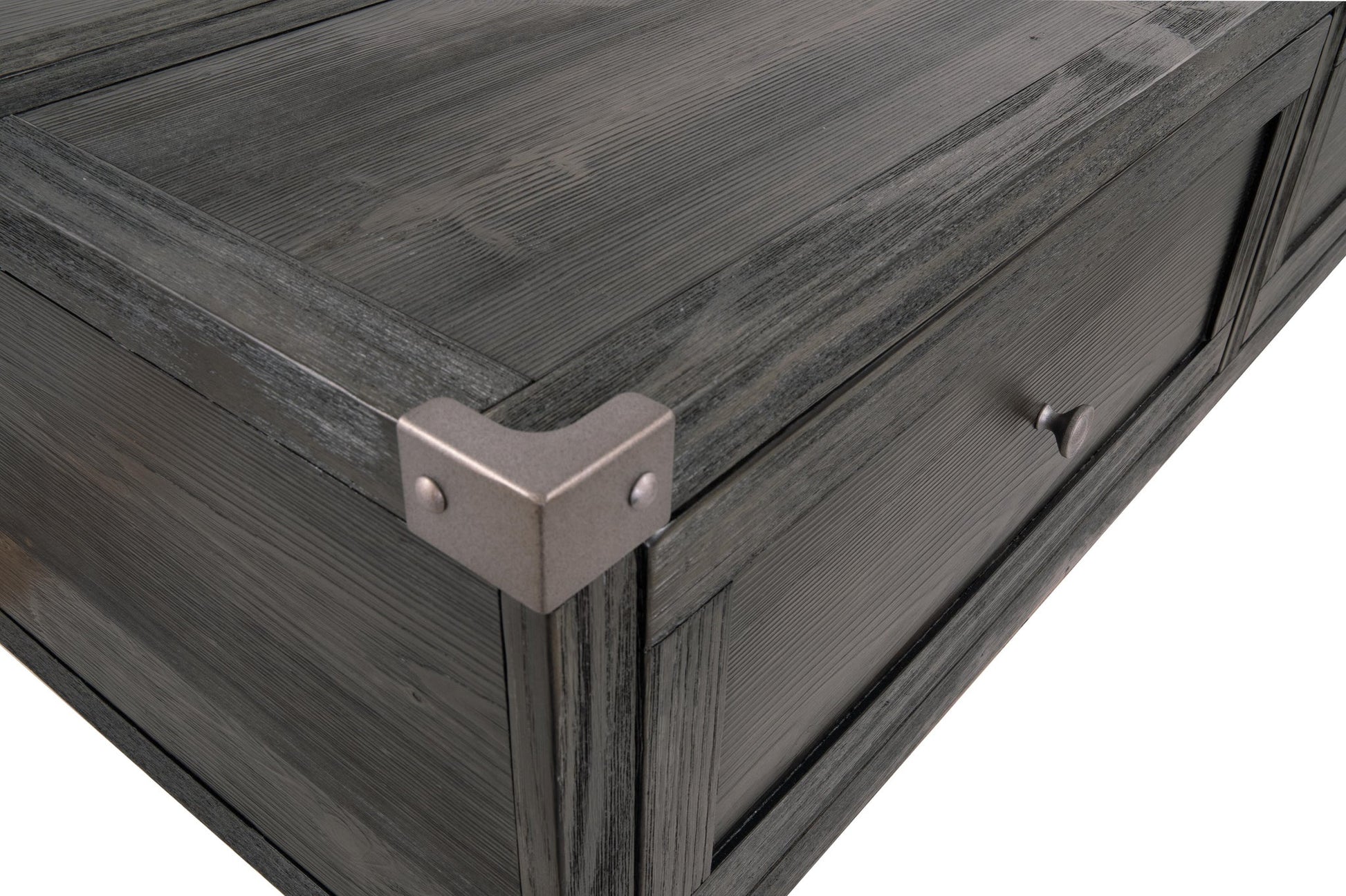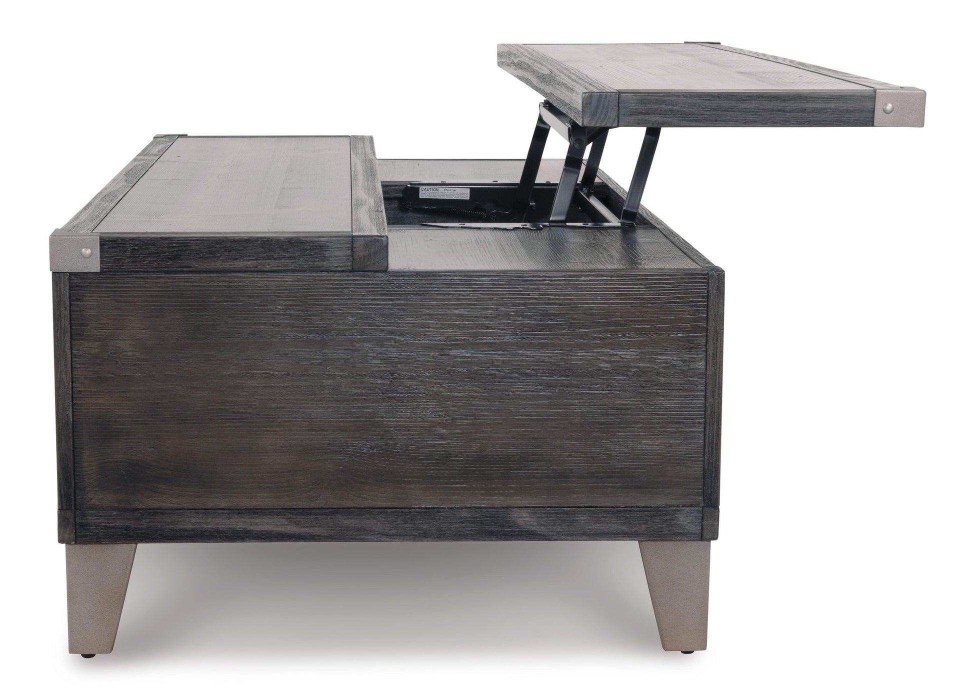 Mixed material lift top table truly elevates rustic-industrial style. Weather-washed pine wood and veneers are contrasted with canted metal legs and corner bracket accents for a uniquely chic merger of earthy beauty and contemporary flair. A handy spring-loaded mechanism brings the tabletop to you, while two drawers with removable storage trays are packed with possibilities.