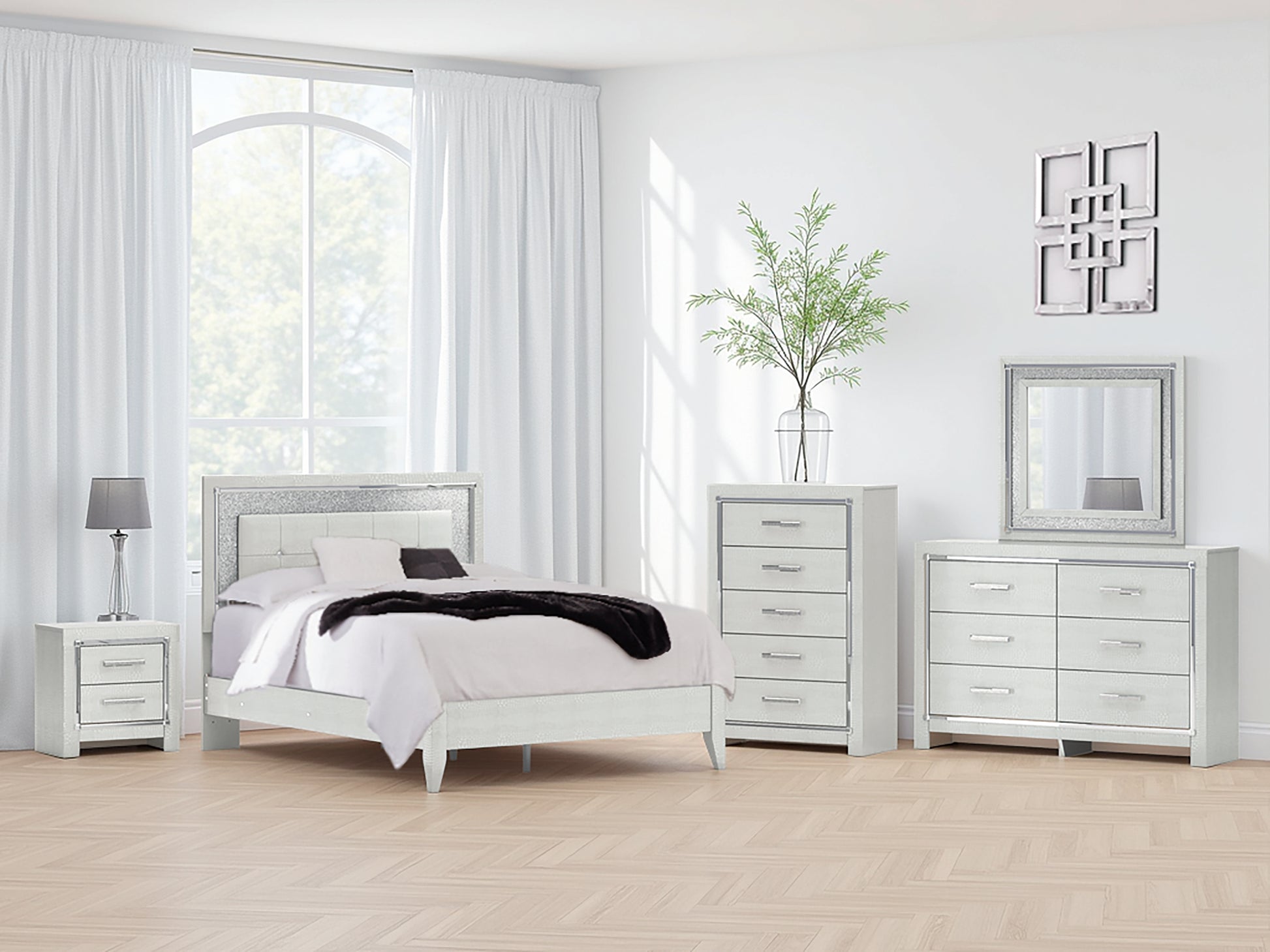 Includes upholstered panel headboard and panel footboard with rails, Made with engineered wood (MDF/particleboard/plywood) and decorative laminate for the right balance of affordability and durability, Silvertone pearl finished faux gator, Decorative laminate replicates natural or man-made material surfaces with consistent color, pattern and texture, Headboard with faceted chrome-tone details, faux crystal tufted silver upholstery with faux alligator effect and glitter inlays, Headboard includes LED lighting with remote for color and brightness options; included holder discreetly keeps remote accessible, Foundation/box spring required, sold separately, Mattress available, sold separately, Minor assembly required